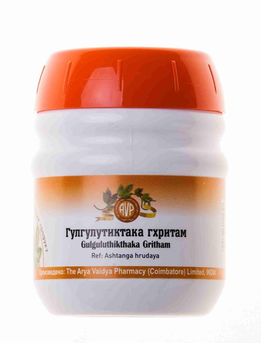 Гуггулутиктака гхритам (Гуггулу тиктака грита), GULGULUTHIKTHAKA GHRITAM 200 ML Гуггулутиктака гхритам - многокомпонентный аюрведический препарат в виде лекарственного травяного масла, приготовленного на основе пяти горьких трав: нима (Azadirachta indica), гудучи (Tinospora cordifolia), брихати (Solanum indicum), васы (Adhatoda vasica), патолы (Trichosanthes dioica), а также 26 целебных растений. Состав был разработан представителями керальской (южной) школы Аюрведы и на протяжении длительного времени используется в качестве эффективного лекарственного препарата широко спектра действия: при лечении глубоких язв, абсцессов, заболеваний кожи, сердечно-сосудистой системы и органов дыхания, в том числе, воспалений носовых пазух, астмы, ринита, кашля, простудных заболеваний и подагры. Эффективно и быстро охлаждает воспаленные участки тела в силу выраженных анти-Питта свойств. Гуггулутиктака гхритам считается одним из лучших лекарственных средств для лечения псориаза и артрита. При внутреннем употреблении улучшает работу пищеварения, очищает кровь (ракта-дхату) от токсинов. При кожных заболеваниях Вата и Капха-типа часто используется в виде масляных питательных микроклизм (анувасана басти). Гхритам - одна из форм аюрведических препаратов в виде плотного масляного экстракта, который в большинстве случаев может использоваться как для наружного, так и для внутреннего употребления. Готовится по специальным технологиям, обеспечивающим максимальную и бережную экстракцию целебных компонентов из растений. Быстродействие и эффективность данной группы препаратов основано на ряде уникальных свойств топлёного коровьего масла (Гхи): оно одновременно выступает в качестве «проводника» целебных компонентов растений, обеспечивая их сохранность и быструю доставку к самым глубоким тканям и внутренним органам тела, в качестве средства для питания и промасливания организма, а также одного из лучших средств для растворения и выведения из тела токсинов и шлаков (амы), имеющих жирорастворимую природу. Аюрведическая характеристика: успокаивает все три доши - Вату, Питту и Капху. Противопоказания: индивидуальная непереносимость компонентов. Перед применением рекомендуется проконсультироваться с аюрведическим специалистом.