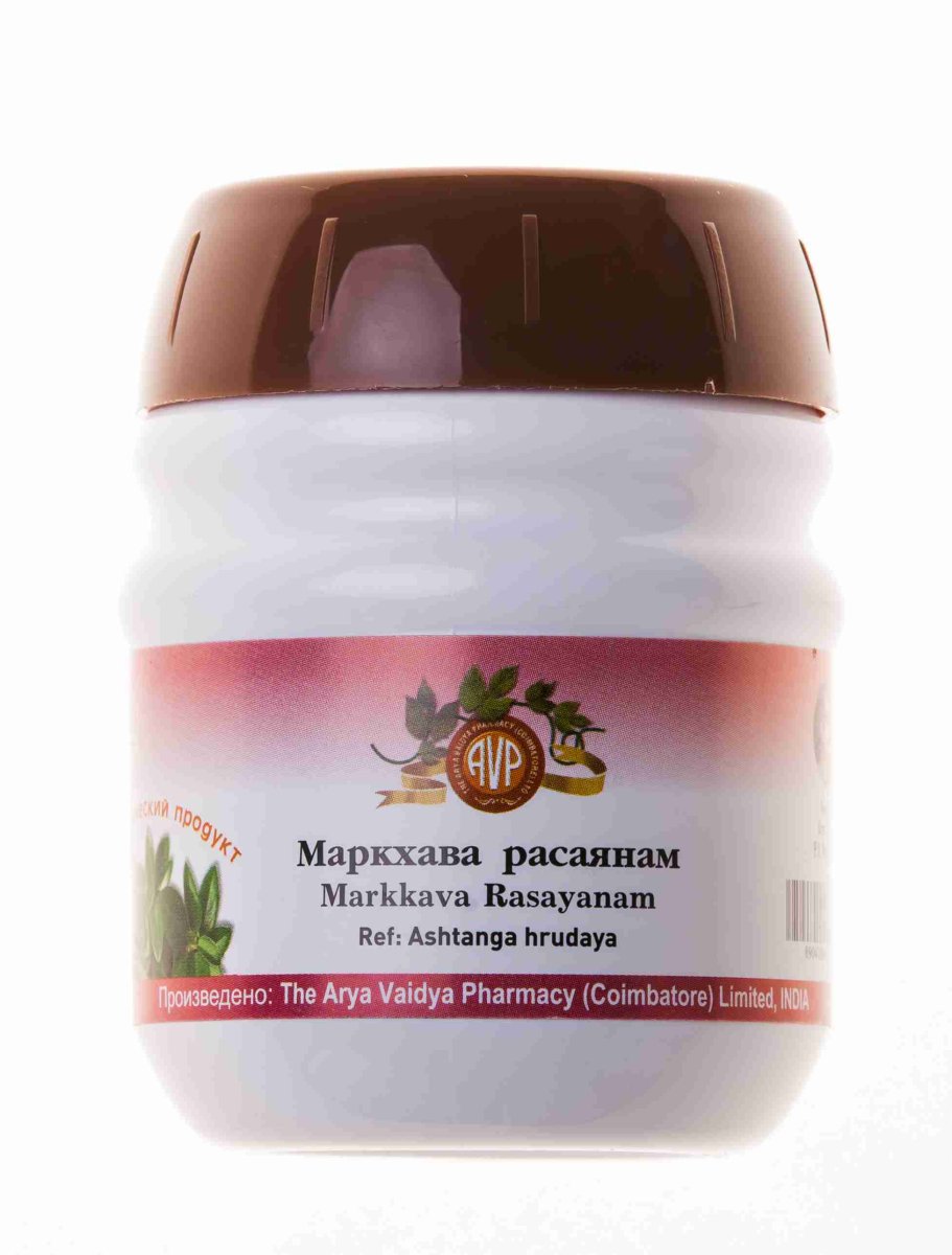 Показания к применению: согласно аюрведическим трактатам: Маркхава Расаяна/Markhava Rasayanam высоко ценится в аюрведической (древней индийской медицине) практике из-за своих полезных свойств, особенно из-за своей способности излечивать заболевания печени. Марк-хава Расаяна/Markhava Rasayanam укрепляет волосы, делает их здоровыми, стимулирует рост, предотвращает облысение и преждевременную седину. Избавляет от кожных заболеваний, грибков стопы, экземы и дерматита. В Аюрведической медицине считается, что Маркхава Расаяна/Markhava Rasayanam хорошо применяется при лечении алопеции, анемии, бессонницы, хронических форм гепатита, головокружения, дерматита, дизентерии, гастроэнтерита, гематурии, кожных заболеваний, кровотечений, кровохарканья, лейкодермы, люмбаго, облысения, психических расстройств, увеличения селезенки и печени, цирроза печени, цистита, экземы.