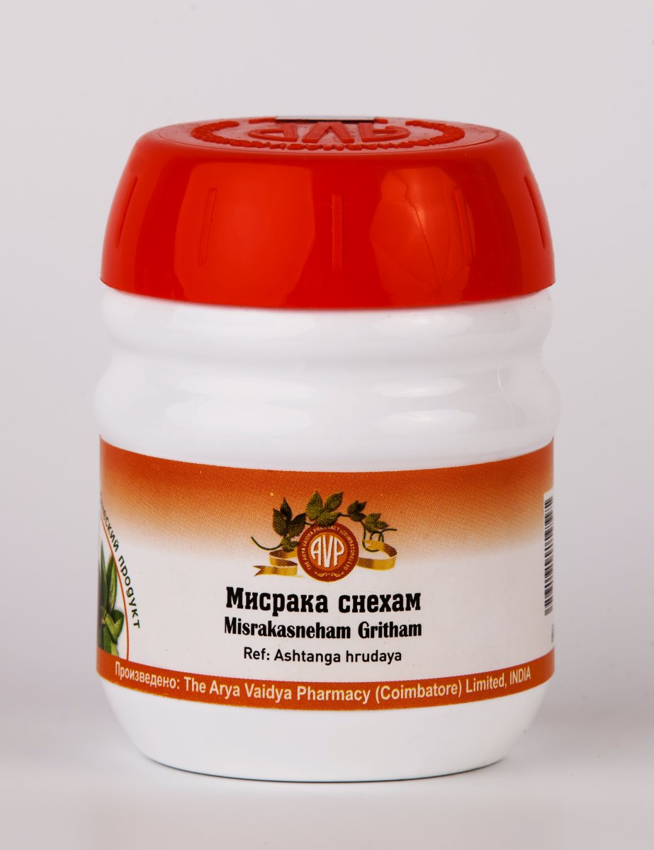 Мисрака снехам Гхритам - препарат на основе масла гхи и аюрведических трав, применяется при сильной зашлакованности кишечника, хронических запорах, метеоризме и кишечных спазмах. Используется в курсе очищающих процедур Панчакармы.