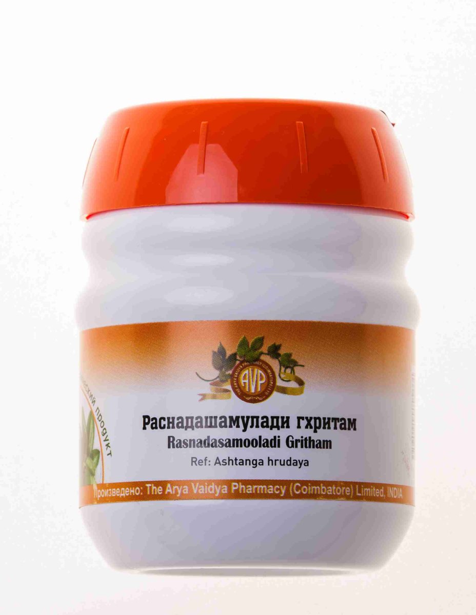 Раснадашамулади гхритам (Расна дашамула гхритам, Раснадашамула грита), RASNADASAMOOLADI GHRITAM 200 ML Раснадашамулади гхритам - многокомпонентный лекарственный препарат Аюрведы, в котором легендарная формула «Дашамула» из 10 корней целебных растений сочетается с корнем калгана лекарственного (Alpinia calcarata) и 13 другими растительными компонентами. Препарат приготовлен по традиционным технологиям с добавлением коровьего масла (Гхи), молока и отвара из козьего мяса. Традиционно используется в Аюрведе для лечения параличей, в особенности лицевого нерва, ревматических болей и невралгических заболеваний, треморов и головокружений. Применяется в целях профилактики кашля, бронхита, астмы, и других заболеваний верхних дыхательных путей. Один из основных действующих компонентов препарата - калган лекарственный (на санскр. «расна»), - обладает мощными противовоспалительными свойствами и способностью убивать раковые клетки, предотвращая развитие злокачественных новообразований. Раснадашамулади гхритам оказывает благотворное воздействие на работу сердечно-сосудистой и мочеполовой систем. Гхритам - такая форма аюрведических лекарственных средств, в которой особенным образом подготовленные экстракты целебных трав и растений сочетаются с топлёным коровьим маслом (Гхи), а иногда и другими компонентами животного или растительного происхождения (молоком, мёдом и др.), которые обеспечивают эффективное и максимальное экстрагирование целебных компонентов из растений и трав, а также их быструю и эффективную транспортировку к самым глубоким тканям и органам тела. По убеждению многих врачей Аюрведы, подобная форма препарата является наиболее подходящей для жителей крупных городов, которые ежедневно испытывают повышенные умственные и физические нагрузки, стрессы и беспокойства, а потому особенно нуждаются в покое, которого можно достичь через успокоение Вата и Питта-доши с помощью глубокого промасливания и умащения организма. Кроме того, при попадании в организм топлёное масло (Гхи) способствует растворению и выведению из организма глубоко залегающих токсинов и шлаков (амы), которые, как известно, имеют жирорастворимую природу. Аюрведическая характеристика: обладает выраженными анти-Вата свойствами.