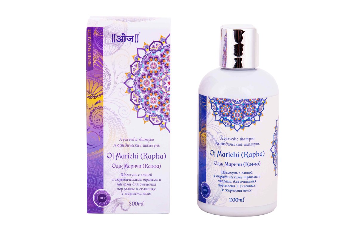 Шампунь Oj Marichi (Kapha) хорошо очищает и удаляет с волос жир, образованный повышенной активностью сальных желез. Не утяжеляет волосы. Волосы достаточно долго остаются чистыми, позволяет мыть волосы намного реже. Устраняет перхоть. Защищает кутикулу волос от внешнего воздействия окружающей среды. Стимулирует рост волос. Локоны становятся шелковистыми, гладкими, послушными. В состав шампуня входят: глина Мултани Митти (Multani Mitti), бобы шикакай (Shikakai), масло лемонграсса (Lemon Grass Oil), камфорное масло (Camphor Oil), эфирное масло черного перца (Black Pepper Essential Oil), эфирное масло мускатного ореха (Nutmeg Essential Oil), витамин Е (Vitamin E Acetate), DL-Panthenol. Мултани Митти - удаляет примеси и загрязнения, при этом не сушит волосы. Придает волосам блеск, восстанавливает их природный цвет и придает шелковистость. Удаляет перхоть. Шикакаи - натуральное средство для мытья волос и тела. Восстанавливает сухую пористую структуру волос, активирует рост волос. Прекрасно растворяет жиры и грязь. Основательно укрепляются корни волос. Успешно борется с перхотью. Масло Лемонграсса - обладает подсушивающим, антибактериальным, стимулирующим, тонизирующим свойством. Укрепляет волосяные фолликулы, останавливает и предотвращает выпадение, стимулирует рост волос. Камфорное масло - питает корни и препятствует выпадению волос, стимулирует рост волос и регенерирует поврежденные волосяные фолликулы, укрепляет корни, питает кончики и обволакивает волосы, которые находятся в своеобразном «коконе», к предотвращающем их дальнейшее повреждение. Черный перец - стимулирует рост волос, ускоряет регенерацию кожи головы, останавливает преждевременное выпадение волос (облысение), укрепляет волосяные луковицы, стимулируя кровообращение. Устраняет появление пер-хоти и добавляет объем волосам. Мускатный орех - обладает выраженными регенерирующими и укрепляющими свойствами. Эффективно лечит облысение. Восстанавливает сухие, поврежденные, ломкие и ослабленные волосы. Витамин Е ацетат - увлажняет и лечит поврежденные, ломкие волосы, стимулируя их рост, восстанавливает кожу головы, предотвращая выпадение волос. DL-Пантенол - утолщает волосы, придавая блеск и глянец, обеспечивает регенерацию и глубокое увлажнение волос и кожи головы.