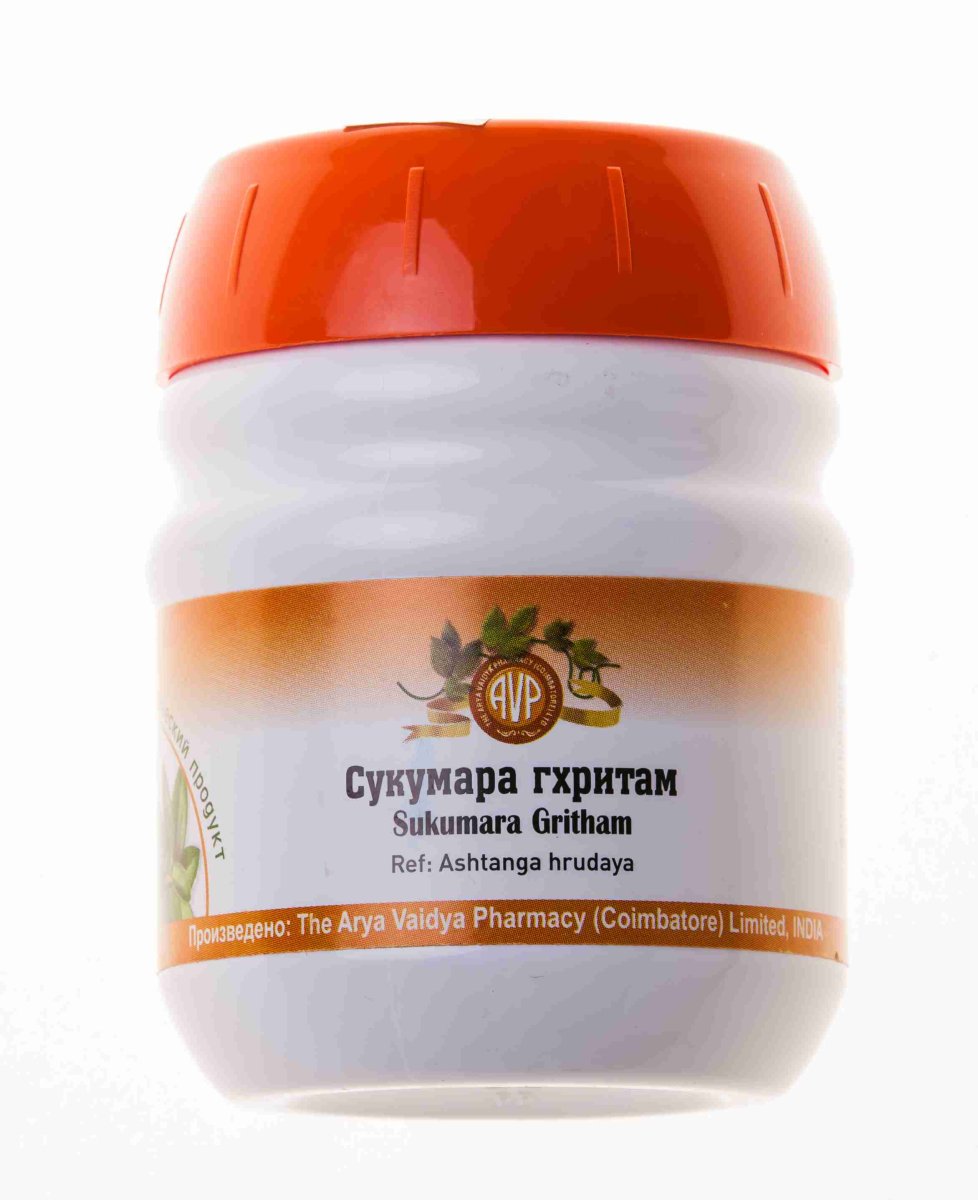 Сукумара гхритам (Сукумара гритам), SUKUMARA GHRITAM 200 ML Сукумара гхритам - многокомпонентный аюрведический препарат на основе группы трав под названием «Видарьяди», упоминаемых в аюрведическом трактате «Аштанга-хридая-самхите» («Сутрастхана», 15/9-10) и приготовленных по традиционным технологиям методом вываривания в топлёном коровьем масле (Гхи). Рецептура Сукумара гхритам была разработана в рамках южной (керальской) школы Аюрведы и на протяжении длительного времени используется в лечении широкого спектра гинекологических заболеваний (ПМС, боли внизу живота, парапроктит, менструальные боли, нарушения кровотока и воспалительные процессы в органах малого таза, бесплодие, миома матки, поликистоз яичников и др.). Оказывает благотворное влияние на работу пищеварения, применяется в терапии заболеваний ЖКТ, изжоги, геморроя, хронических запоров, грыжи и др. Сукумара гхритам восстанавливает и питает репродуктивные ткани (шукра-дхату), способствует быстрому восстановлению организма после беременности, родов, выкидышей, укрепляет и поддерживает организм в период кормления грудью. Является прекрасным тоником и общеукрепляющим средством для женского организма, улучшает цвет лица и состояние кожи. Высокая эффективность и быстродействие данного препарата в сравнении с другими средствами на основе этого же состава лекарственных трав обусловлено присутствием в составе топлёного масла (Гхи), молока и мёда. Во-первых, они являются идеальными «анупанами» или «адъювантами» - именно так в Аюрведе называют вещества, выступающие в роли «проводников», которые обеспечивают доставку лекарственных ингредиентов вглубь тканей и внутренних органов. Во-вторых, они обеспечивает длительную сохранность действующих компонентов, консервируя их и с течением времени только усиливая их целебные свойства. В-третьих, топлёное масло способствует наилучшей усвояемости лекарственного средства, благодаря своей способности к растворению и выведению глубокозалегающих токсинов и шлаков (амы), а значит и воспринимающей способности организма. Аюрведическая характеристика: уравновешивает Вата и Питта-доши. Рецептура препарата зафиксирована в тексте «Сахасрайогам» (Sahasrayogam, Ghrita prakarana, 4).