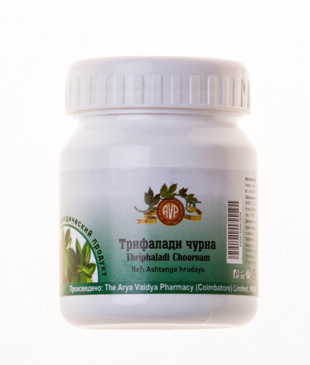 Действие: В Индии Трифалади чурна/Thriphaladi choornam применяется при лечении бессоницы, гастрита, гепатитов, диареи, дисбактериоза, запоров, кашля, колитов, метеоризма, панкреатитов, стрессов, тошноты, холециститов, язвы. Дополнительно к вышеуказанным действиям порошка в традиционной ин-дийской аюрведической медицине считают, что Трифалади чурна/Thriphaladi choornam: - способствует сбрасыванию лишнего веса - регулирует образование гемоглобина в крови - регулирует давление - нормализует зрение - очищает кровь - увеличивает половую активность - обладает выраженной способностью очищать тело от токсинов и омолаживать ткани. Анупана (проводник): мед, масло гхи, теплое молоко, теплая вода.