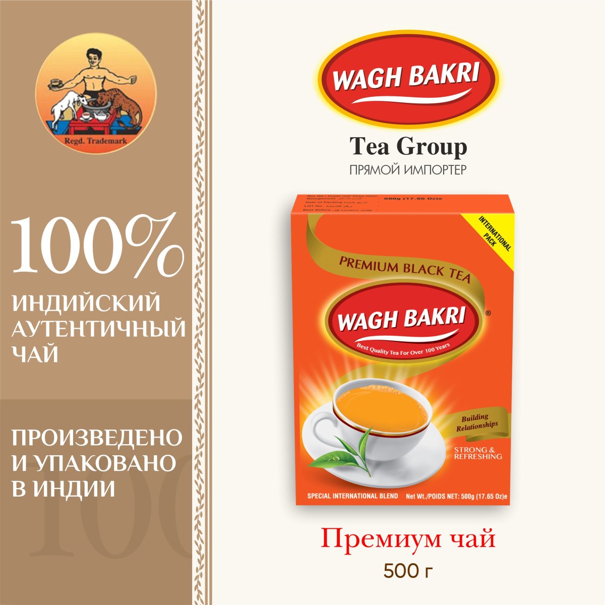 Премиальный чай Wagh Bakri – это чай, специально приготовленный для международного рынка, сохраняющий великолепный вкус, аромат и цвет в каждой чашке чая. Картонная упаковка, используемая для упаковки этого продукта, очень привлекательна и ее легко разместить на полке. Все содержимое этикетки соответствует международным стандартам, а также требованиям к маркировке и законодательству.